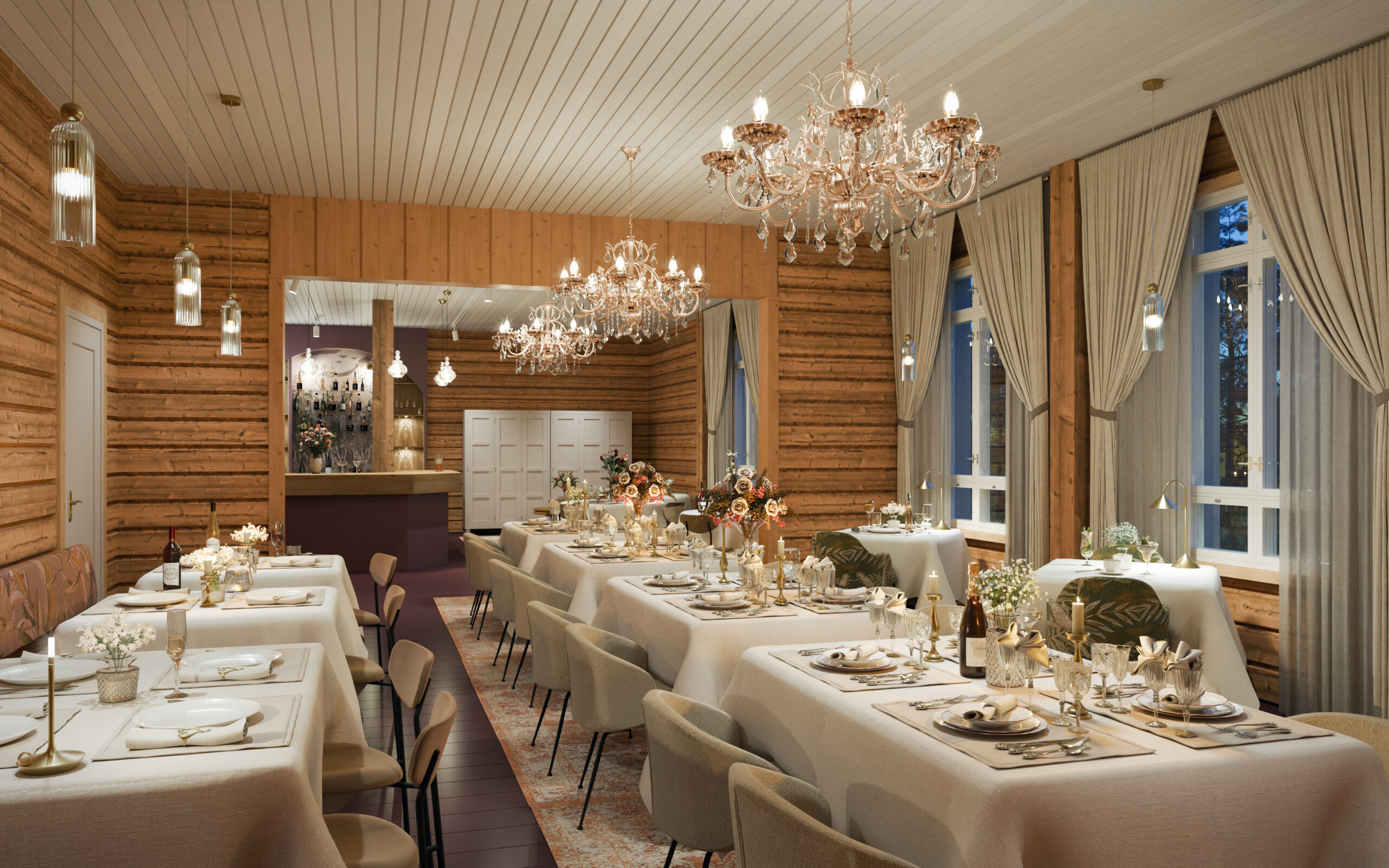 The Grande Suites: Nestled within the historic schoolhouse, these expansive sanctuaries feature hand-restored seventy year old log walls, freestanding bathtubs, and private saunas. For a touch of spontaneous indulgence, a dedicated champagne button ensures a glass of chilled prestige is never more than a moment away.