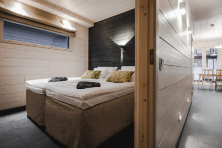Each of the 15 cabins at Brändön Lodge has two bedrooms with 2 single beds in each room. In one room the two single beds can be joined into a double bed...